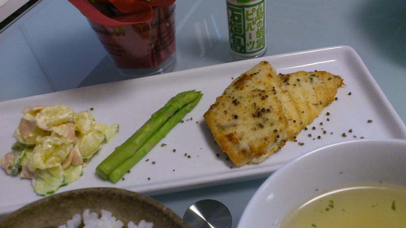 1...白身魚の両面に塩と島の胡椒ピパーツを振り、小麦粉を振ります。