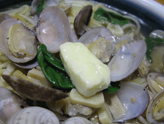 1...フライパンに250ccの水・アサリの水煮を入れ熱し、コンソメを溶かしお好みで塩を少々。