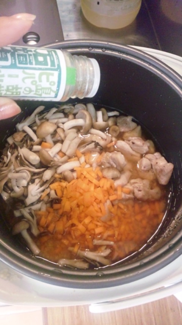 3...にんじんは細かく、きのこも食べやすいサイズに切り、㈰のお肉と一緒に炊飯器に入れます。最後に"島の胡椒ピパーツ"を10回位ふり、炊飯スタート。