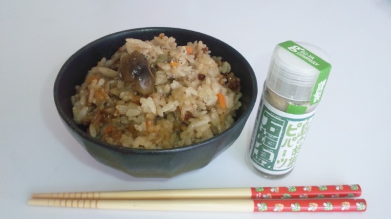 4..炊き上がったら完成です。お好みで食べる前に"島の胡椒ピパーツ"を軽くふってもいい香りがして美味しいですよ♪